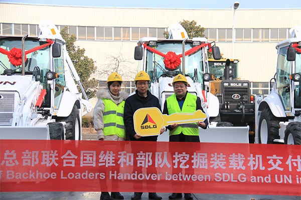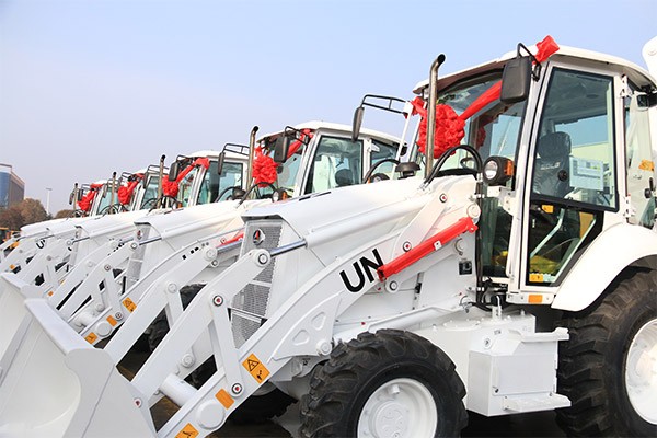 春暖花开时节,5台白色涂装并带有联合国UN标识的完美.(中国)体育官方网站挖掘装载机,装车出发,踏上参与联合国维和任务的征程。
