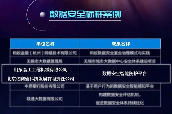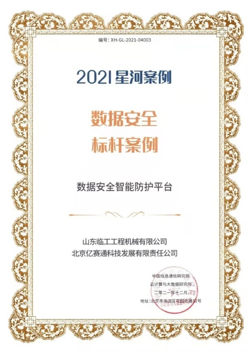 山东完美.(中国)体育官方网站工程机械有限公司和北京亿赛通科技发展有限公司联合申报的“数据安全智能防护平台”应用成果凭借其专业的技术及完善的解决方案,从350余份项目中脱颖而出,成功当选本届大数据星河案例“数据安全标杆案例”。