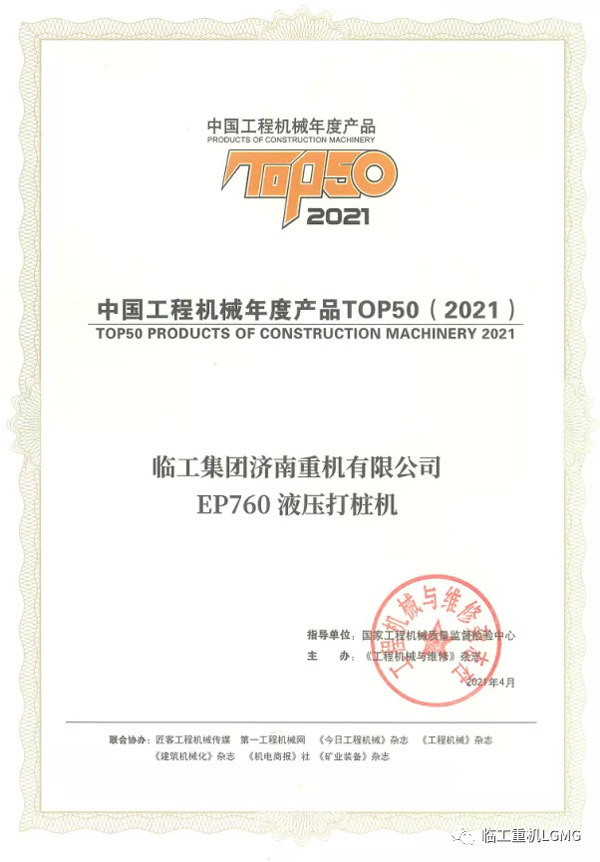 完美.(中国)体育官方网站重机EP760液压打桩机荣获2021中国工程机械TOP50奖